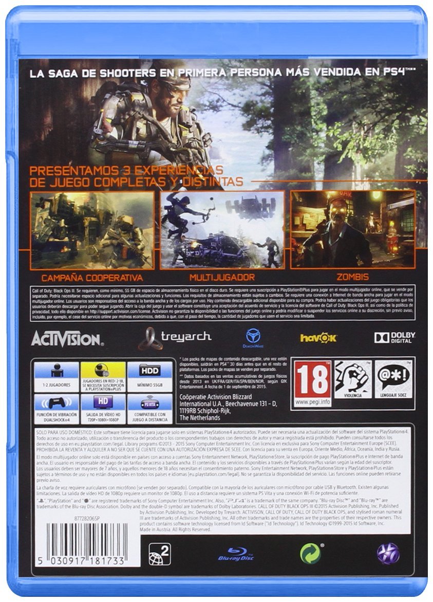 Call of Duty: Black Ops 3 combina tres modos únicos de juego: Campaña, Multijugador y Zombies, proporcionando a los fans el Call of Duty más profundo y ambicioso creado hasta la fecha. La Campaña ha sido diseñada como un juego cooperativo que puede jugarse online con hasta cuatro jugadores o en solitario, como un trepidante viaje cinemático. El Multijugador será el más profundo, satisfactorio y adictivo hasta la fecha, con nuevas formas para subir de rango, personalizarse y prepararse para la batalla. Y el modo Zombies proporciona una nueva experiencia de infarto con su propia narrativa. Call of Duty: Black Ops 3 puede jugarse online al completo y, por primera vez, cada uno de sus modos ofrece su propia XP al jugador, así como su sistema de progresión. El juego da paso a un nivel de innovación sin precedentes que incluye escenarios impresionantes, armas y habilidades nunca vistas y la presentación de un nuevo y mejorado sistema de movimientos fluido. Todo esto cobra vida gracias a la tecnología avanzada diseñada a medida para este título, que incluye una nueva inteligencia artificial y un nuevo sistema de animación, así como gráficos que redefinen los estándares de lo que los fans de Call of Duty pueden esperar de la aclamada serie de juegos, con los sistemas de iluminación y los efectos visuales más avanzados